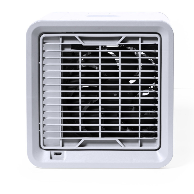 Mini aparelho de ar condicionado portátil para resfriar e purificar o ar. Por ser pequeno e leve, é facilmente transportável. Ventilador com três velocidades à escolha (alta, média, baixa). Inclui um depósito de água de grande capacidade -700 ml-, com possibilidade de adicionar cubos de gelo para obter ar mais fresco. Conecta-se à corrente elétrica através de um cabo de alimentação USB - incluído - e vem apresentado individualmente numa caixa de design kraft. Manual de instruções disponível em espanhol e inglês.