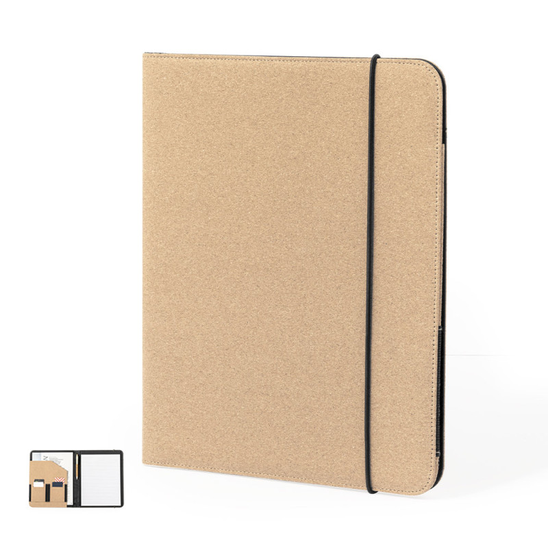 Elegante pasta arquivadora fabricada em cortiça natural. Com bolso interior grande para papéis, 4 porta-cartões, elástico para esferográfica e bloco de 20 folhas pautadas. Fecho mediante uma banda elástica no seu exterior. Apresentada individualmente em bolsa reciclada. Elaborado com elementos vegetais para assim promover a utilização de matérias- primas naturais e reduzir as emisssões poluentes.