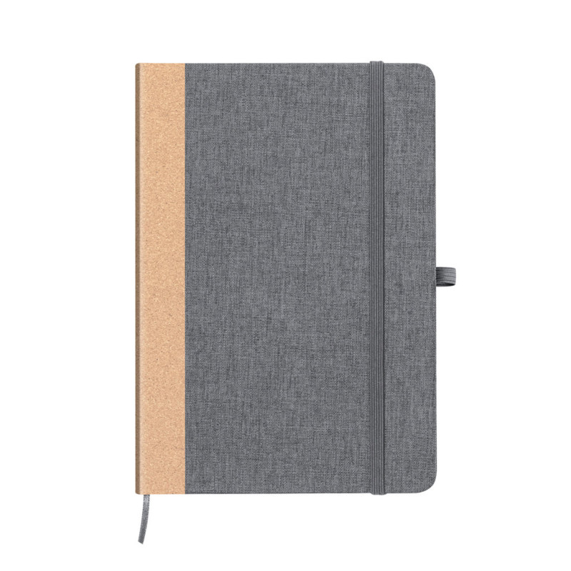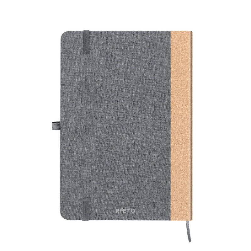 Bloco de notas com capas rígidas fabricadas em RPET, com a lombada em cortiça. Inclui interior com 80 folhas lisas, marca páginas, fecho de elástico e suporte para esferográficoa a condizer. logotipo RPET na contracapa e disponível em elegantes colores. Apresentado numa bolsa individual de papel reciclado.O material RPET é elaborado a partir de plástico reciclado, para assim promover a reutilização de resíduos plásticos e ajudar na sustentabilidade do planeta.