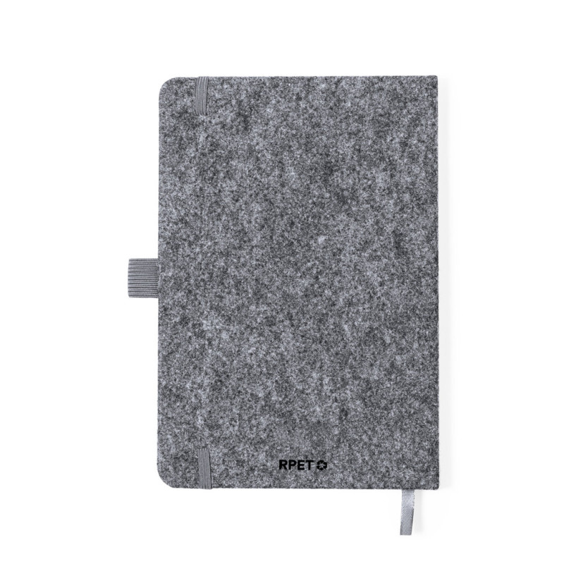 Bloco de notas com suporte de capas rígidas fabricado em feltro RPET 300D. Com original suporte para smartphone e tablet integrado na capa, fabricado em bambu. Inclui elástico de fecho e suporte para esferográfica a condizer, com 80 folhas interiores pautadas. Com logotipo RPET na contra capa e apresentado numa bolsa individual reciclada.O feltro RPET é o resultado da combinação do processo de reciclagem de materiais plásticos junto com a técnica milenar de fabricação do feltro, dando como resultado um material de eco-tendência que, além de ser de origem reciclada, também se converte em reciclável.