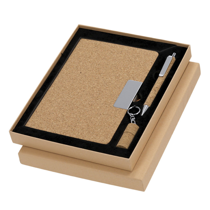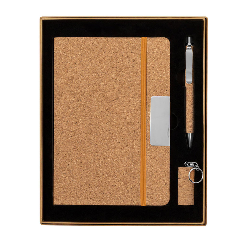 Set de bloco de notas e esferográfica elaborado em cortiça. Inclui:Bloco de notas de capas rígidas, com detalhe metálico na capa, marca páginas de tecido e elástico de sujeição a condizer. 80 folhas interiores pautadas. Esferográfica com corpo revestido em cortiça macia. Elegante clip metálico e acessórios a condizer, de mecanismo pulsador e em tinta azul. Porta-chaves memória USB de 16GB em forma de rolha de garrafa. Set apresentado em elegante estojo de design em cor kraft, com compartimento independente para cada artigo.Elaborado com elementos vegetais para assim promover a utilização de matérias- primas naturais e reduzir as emisssões poluentes.