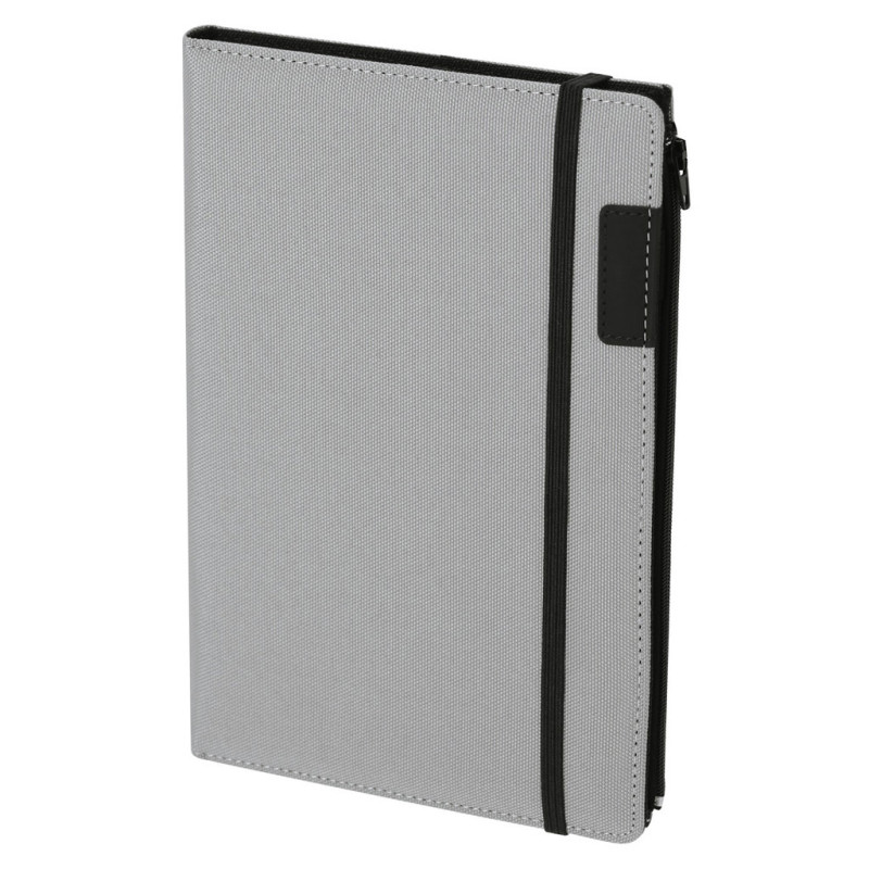 Bloco de notas com capa. Conteúdo:- Bloco de notas tamanho A5, com capas rígidas e 100 folhas de layout listrado único.- Capa feita de RPET 600D, com bolso lateral com zíper útil, ideal para manter itens pessoais à mão. Removível e reutilizável em outros modelos de bloco de notas, tornando-se uma solução versátil e sustentável. Com suporte para caneta e fecho elástico na cor preta. Logotipo RPET na contracapa.O material RPET é feito de plástico reciclado, promovendo assim a reutilização de resíduos plásticos e ajudando na sustentabilidade do planeta.