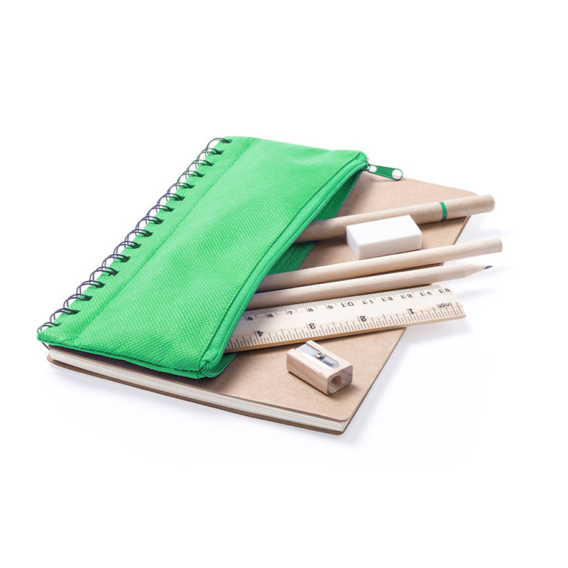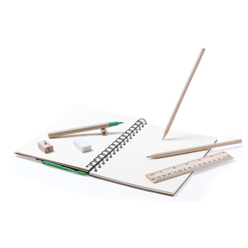 Anel no bloco de notas com tampas de toque suave terminadas em papelão reciclado resistente. Com estojo de poliéster 600D no fechamento de colous e zíper brilhante na capa. Inclui caneta e régua de bola de papelão reciclados, lápis e apontador de lápis em madeira natural. 70 folhas em branco.