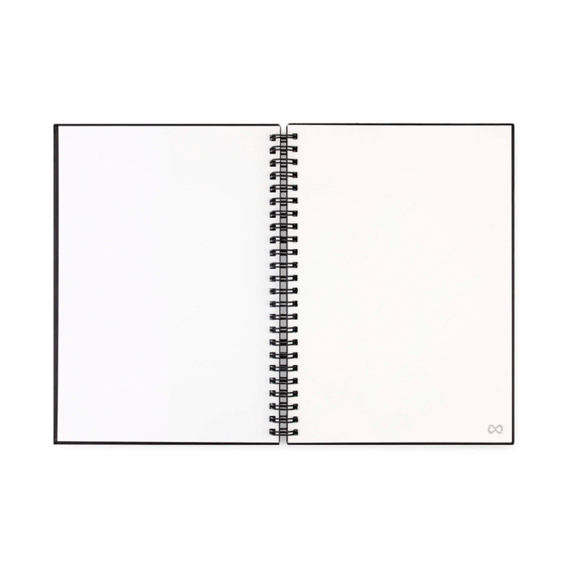 O starter kit "Infinitebook" A5 permite-lhe apagar com facilidade tudo aquilo que escreve, recomeçando os seus apontamentos as vezes que quiser. Composto por 1 "Infinitebook" com capa dura e argolas, 1 kit de limpeza (recipiente spray vazio, esponja e u1m pano), 1 marcador e um suporte para marcador. O miolo do "Infinitebook" é, constituído por 1 página para registar as suas tarefas e 35 páginas lisas estilo quadro branco para tomar as suas notas. As notas podem ser digitalizadas. Fabricado na Europa. Os produtos são fornecidos dentro de uma caixa. 148 x 210 mm | Caixa: 225 x 175 x 46 mm