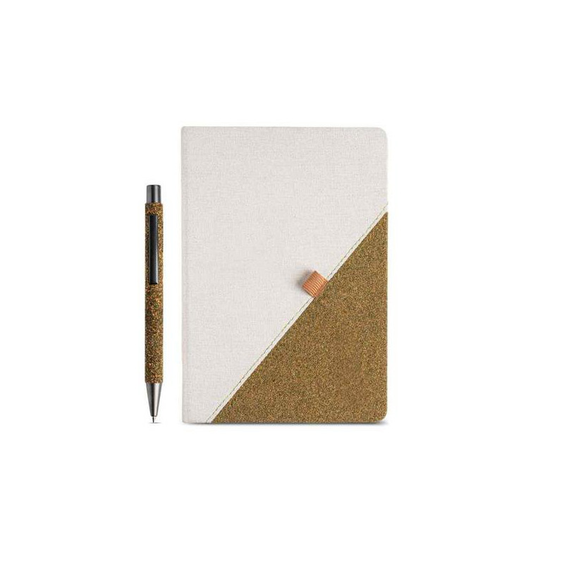 Conjunto ecológico composto por bloco A5 e esferográfica, ideal para quem valoriza sustentabilidade aliada a um design contemporâneo. Contém 160 páginas de cor bege, de papel proveniente de florestas geridas de forma responsável. O bloco possui capa rígida revestida em algodão reciclado com incorporação de resíduos de chá verde, conferindo-lhe uma textura natural e distinta. Na capa destaca-se um suporte para esferográfica, posicionado na diagonal e em tom castanho, combinando com o fitilho marcador incluído. A esferográfica, em metal cinza escuro, é igualmente revestida com resíduos de chá verde e equipada com tinta preta. Um conjunto elegante, funcional e com consciência ambiental.