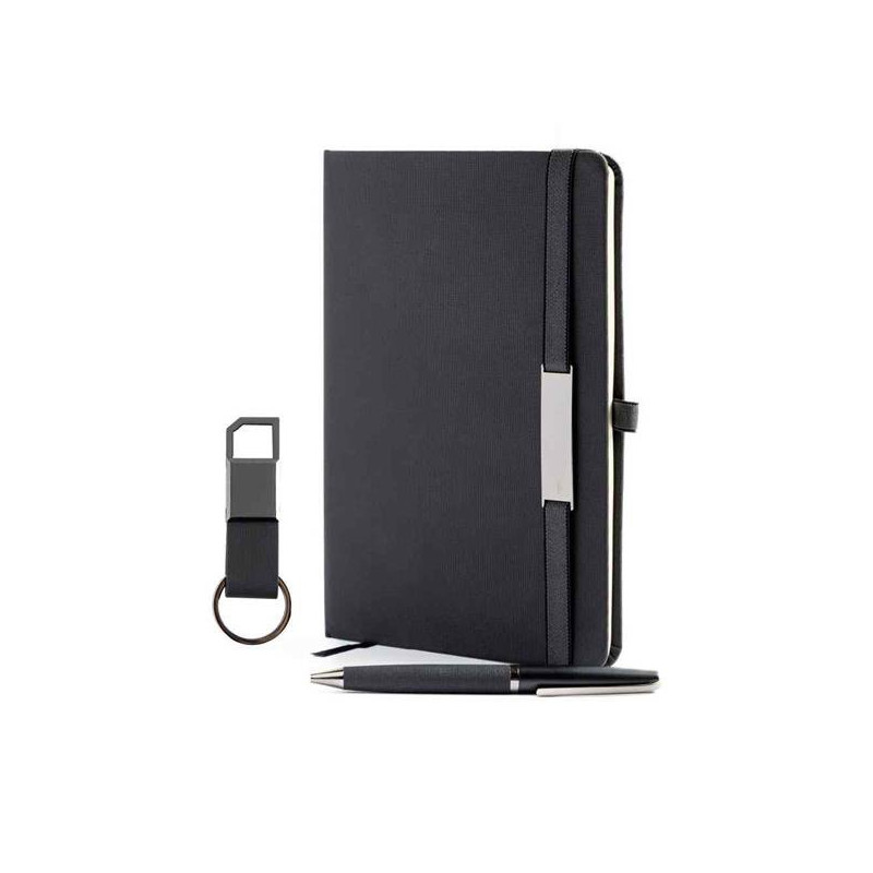 Conjunto elegante composto por três elementos harmoniosamente combinados. Inclui um bloco A5 com capa rígida revestida em tecido PU, elástico com detalhe metálico espelhado e fitilho a condizer. Com 160 páginas pautadas, é ideal para anotações, esboços ou registos do dia a dia. A acompanhar, uma esferográfica em metal preto espelhado com corpo em PU, que oferece uma escrita fluída na cor preta. O conjunto integra ainda um porta-chaves em PU com anilha metálica preta espelhada. Todos os artigos são apresentados numa sofisticada caixa de oferta preta, envolta por uma manga branca, tornando este conjunto uma escolha distinta para brindes corporativos, ocasiões especiais ou presentes memoráveis.