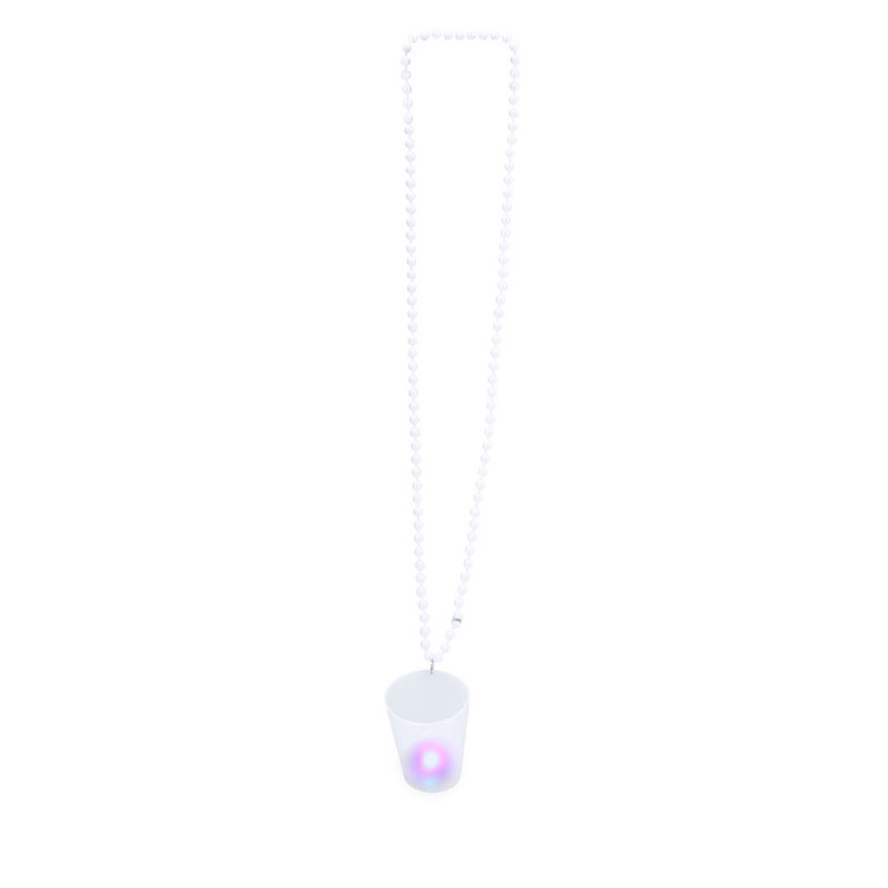 Copo tamanho shot com luzes LED e 50 ml de capacidade. Fabricado em PS. Inclui cordão prático para pendurá-lo confortavelmente no pescoço. Possui um botão na base para ativar as luzes, oferecendo 3 modos de iluminação: luz fixa e intermitente em diferentes velocidades. Alimentado por pilhas de botão (incluídas). Livre de BPA.