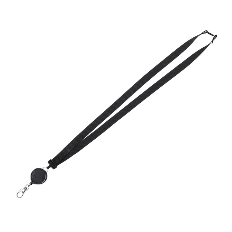 Lanyard de poliéster prático com acessório extensível. Acessório de segurança no pescoço e acessório retrátil extensível com clip de ajuste de um lado, deixando o outro lado livre para personalização. Mosquetão metálico. Conjunto disponível nas cores preto e branco.