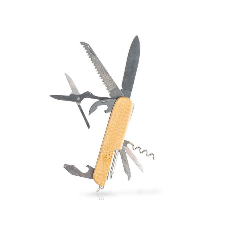 Canivete multifunções em bambu e aço inoxidável. Um canivete multiusos muito prático e fácil de transportar. Com ferramentas em aço inoxidável e cabo em bambu resistente. Incluí 9 funções - Abre garrafas, lima e limpa unhas, lâmina pequena, abre-latas, abre caricas, serra, lâmina de faca, tesoura.