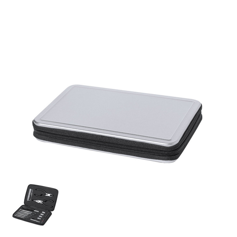 Conjunto de ferramentas de 25 acessórios num resistente estojo de alumínio com interior recortado em EVA. Inclui conjunto de chaves de fendas de precisão, ferramenta multifunção, pontas intercambiais,chaves de fendas plana e de estrela cabeças de tubo pinças e alicates. Apresentado em caixa individual.