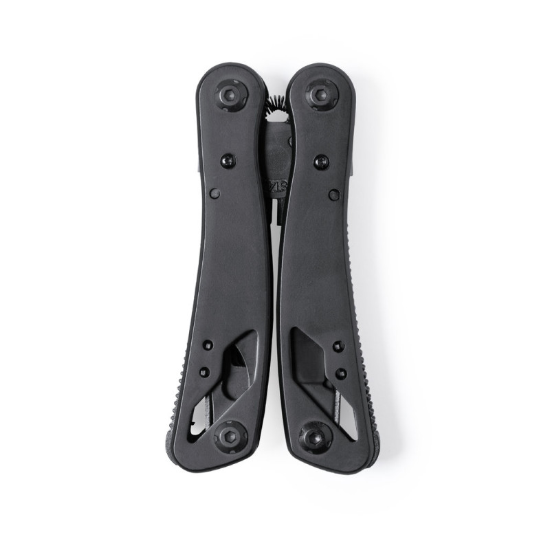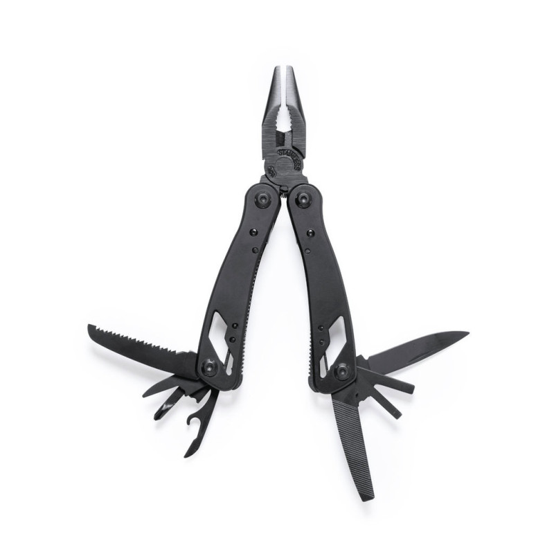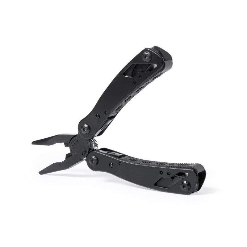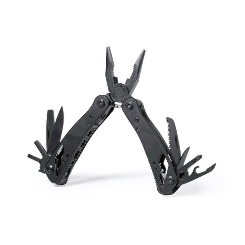 Multi-ferramentas com acessórios em acabamento em aço inoxidável preto e pega de correspondência resistente em alumínio. Com 13 funções, incluindo colher e canivete, chave de fenda, abridor de cápsulas e alicate. Dobrável e compacto em tamanho, apresentado em uma caixa de design preto individual.