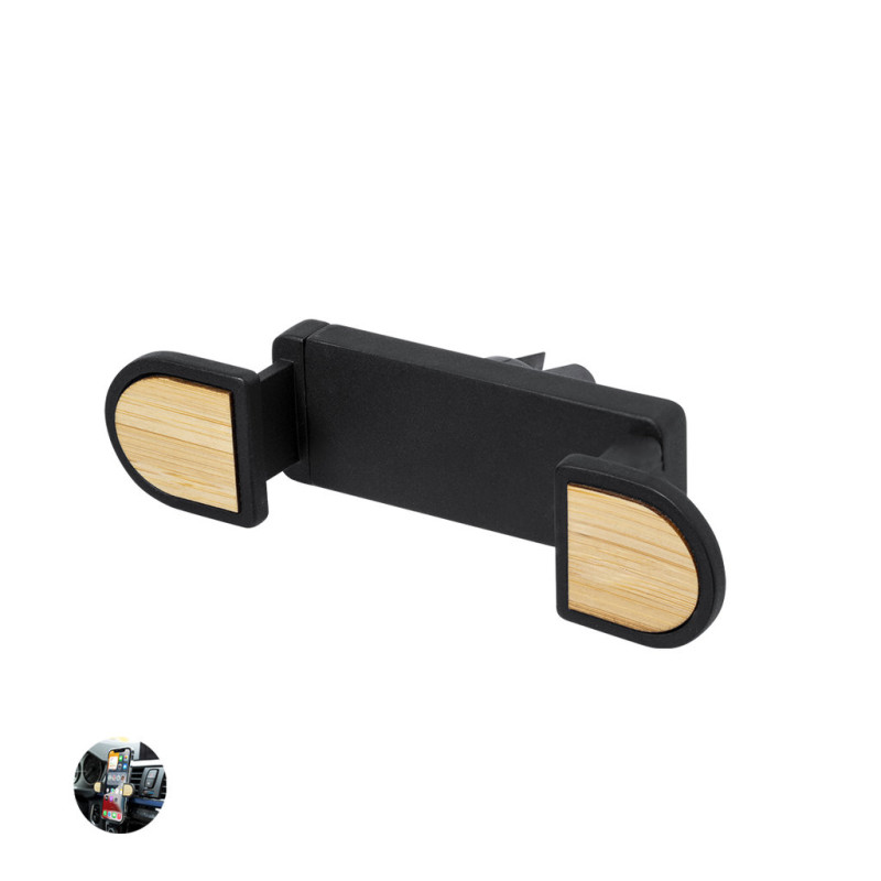 Suporte ajustável para smartphone de design minimalista, com base rotativa de 360° e de elegante acabamento na cor preta com pormenores em bambu. Com sistema de fixação na grelha de ventilação do automóvel e ampla superfície de impressão, especialmente concebida para tampografia. Apresentado numa caixa de design kraft. Materiais como o bambu promovem a utilização de matérias-primas naturais, reduzindo as emissões poluentes. Provém de uma planta de grande resistência e versatilidade, com crescimento e regeneração rápidos, sendo uma excelente alternativa à utilização da madeira tradicional.