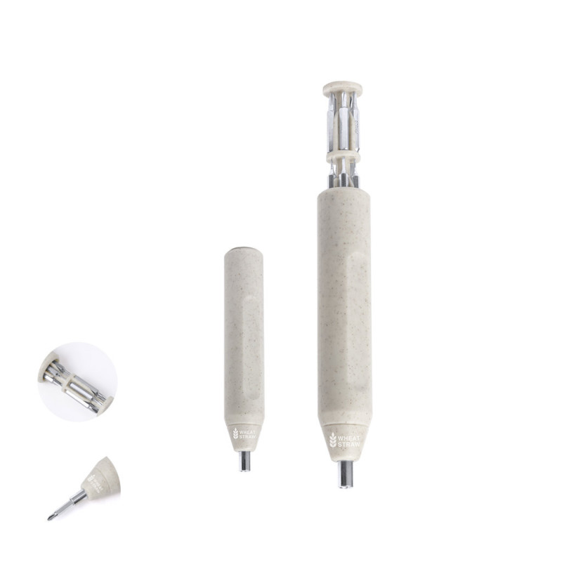 Prática multi-ferramentas fabricada em palha de trigo em forma de chave de fendas. Inclui um compartimento no cabo para guardar várias pontas magnéticas (planas e philips). Com distintivo de palha de trigo. Apresentado numa caixa de design kraft. A cana de trigo promove a utilização de matérias-primas naturais, reduzindo assim as emissões poluentes.