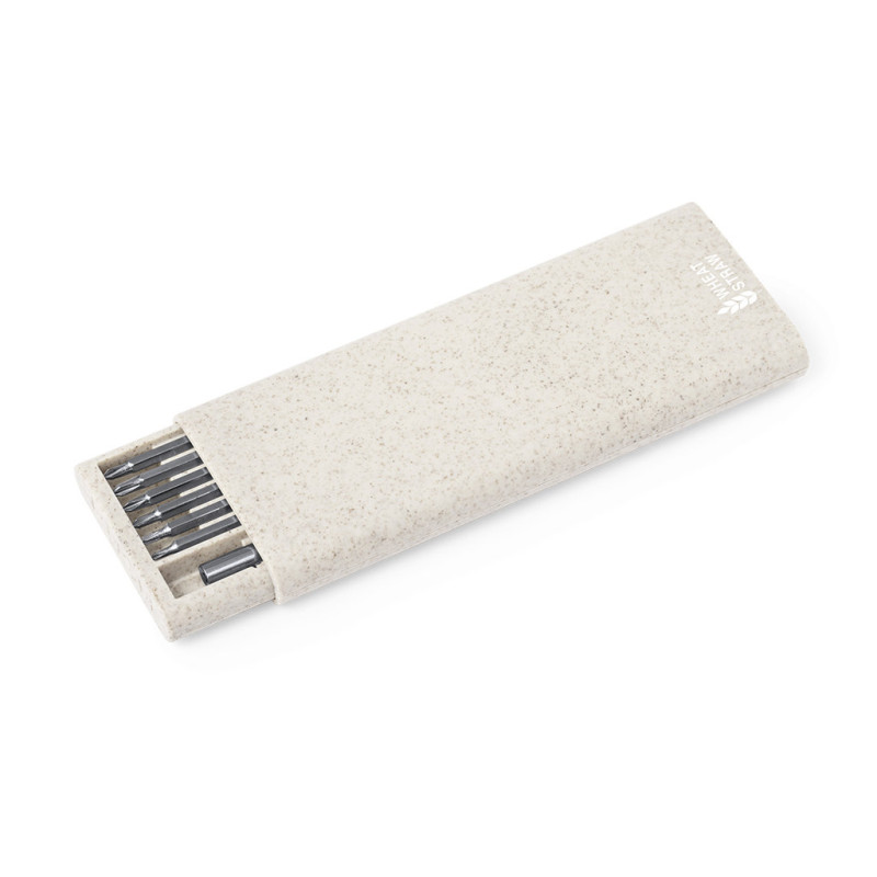 Prático set de ferramentas fabricado em palha de trigo e recortado no interior para um ajuste perfeito. Inclui uma chave de fendas de precisão com 24 acessórios, composta por diversas pontas: philips, allen e planas. Com distintivo de palha de trigo incluído. Apresentado individualmente em caixa de design kraft. A palha de trigo promove a utilização de matérias-primas naturais, reduzindo assim as emissões poluentes.