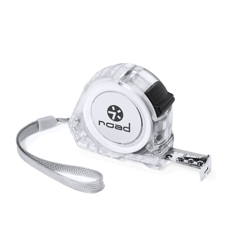 Fita métrica de 5 metros com fita metálica e mecanismo de bloqueio. Com corpo original em acabamento transparente, clip para cinto e alça de transporte em metal, com área especial para impresão. Embalado individualmente em caixa de design kraft.