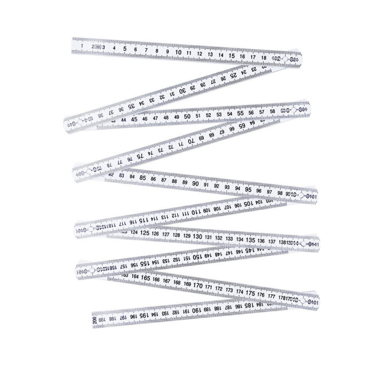 Régua dobrável de 2 metros em fibra de vidro resistente. Com uma escala preta em centímetros visível em ambos os lados. Com posições ajustáveis a 90º, 180º e 270º para maior versatilidade.