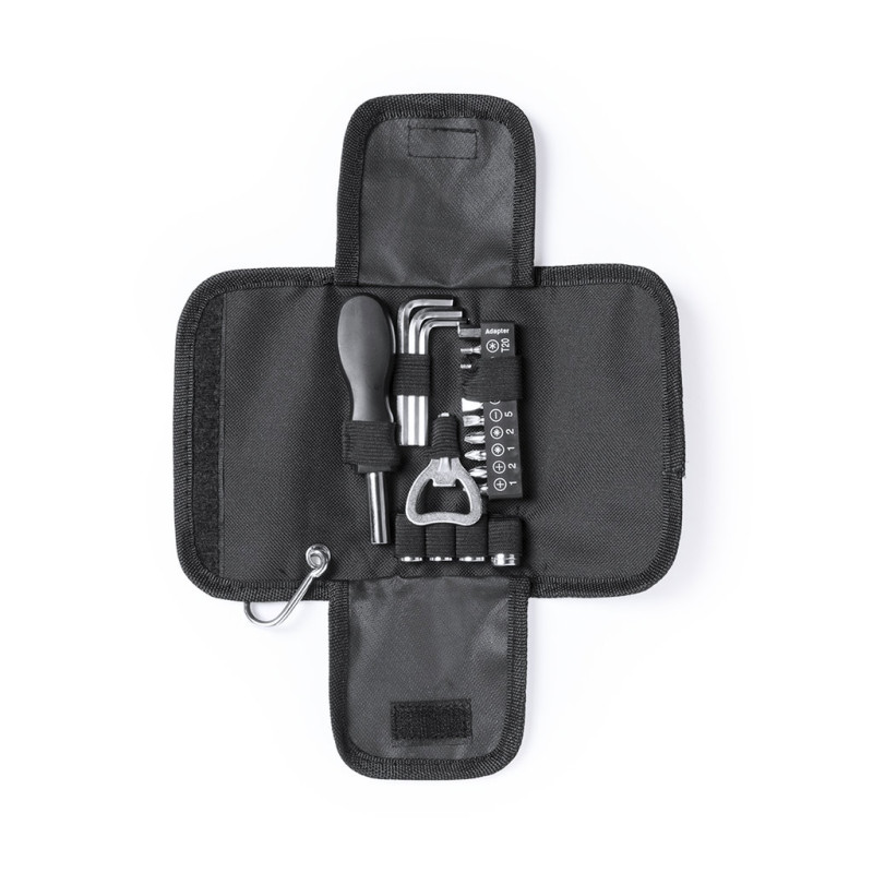 Conjunto de ferramentas de 19 acessórios em estojo de poliéster resistente com fechamento do zíper. Inclui ferramenta de montagem, cabeças de chave de fenda, Crosshead e Torx, conjunto de teclas Allen, chaves para nozes hexagonais e abridor. Com moça de transportador metálico.