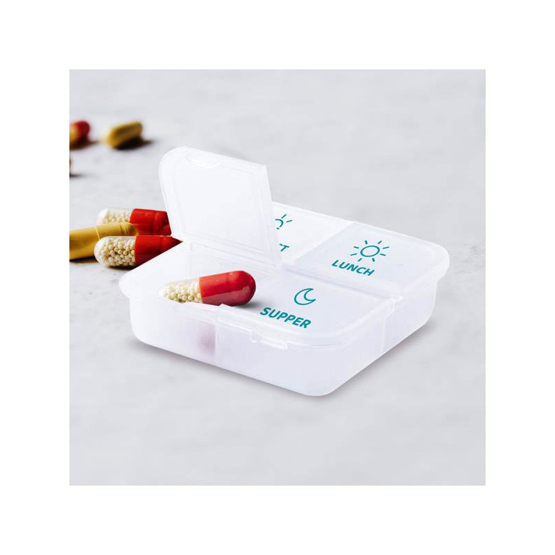 Caixa de comprimidos quadrada, 4 divisões. Uma caixa em PP, que pode trazer sempre consigo, para nunca se esquecer da sua medicação. Os quatro compartimentos divididos e com tampas individuais, facilitam as tomas ao longo do dia. Boa área de gravação. Fabricado em Portugal.
