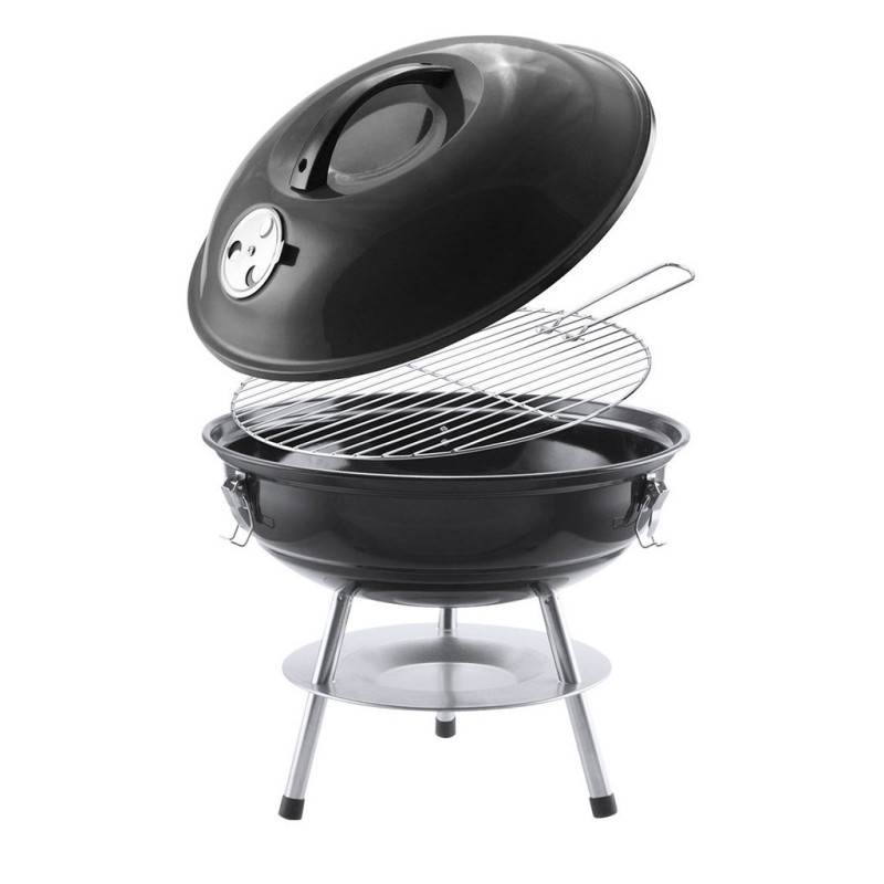 Barbecue fabricado em resistente aço de carbono de acabamento preto. Tampa com cómoda asa e orifícios de ventilação, com grelha metálica, prato antigotas e pés antideslizantes. Apresentado numa atrativa caixa de design.
