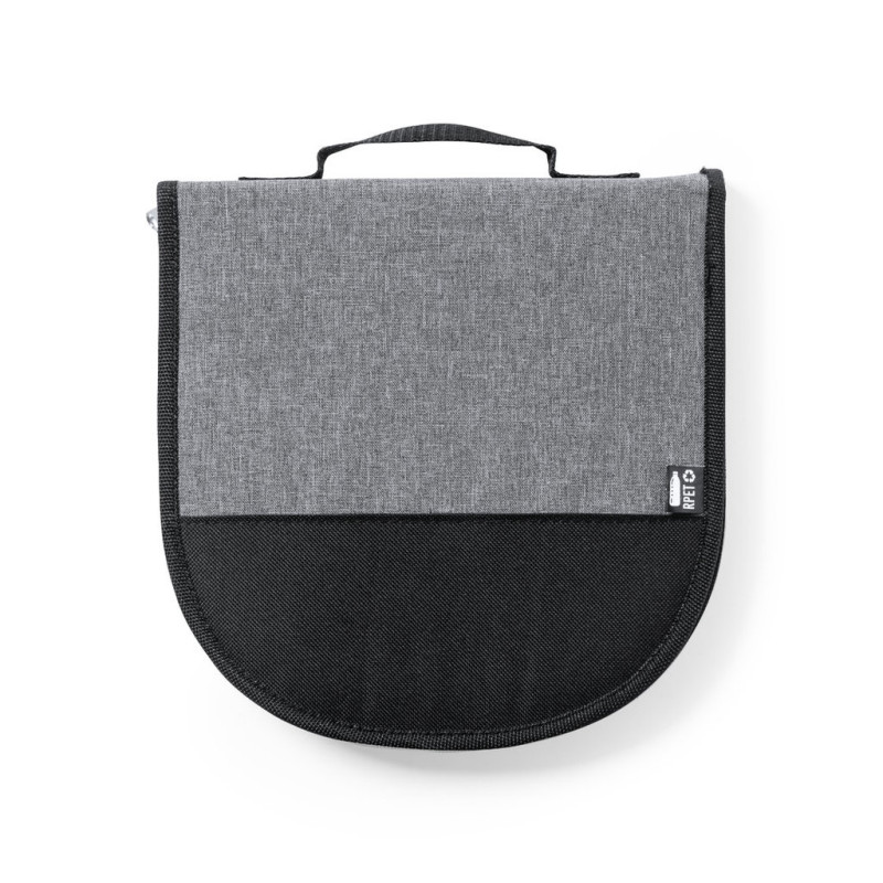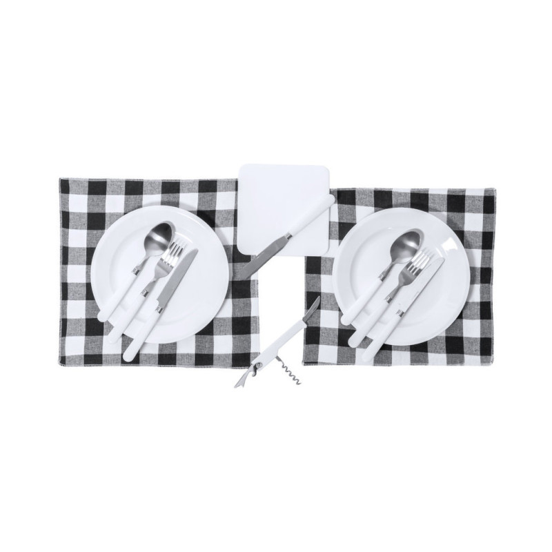 Original conjunto de picnic de 2 serviços. Apresentado em resistente bolsa 600D RPET, com fecho de correr, asa de transporte e etiqueta exterior com distintivo RPET. Interior reforçado, com compartimentos para os diferentes acessórios. Conteúdo: 2 colheres, 2 facas, 1 faca de espalhar e 2 garfos em aço inox com cabo em PP branco2 pratos em PP branco de 23 cm de diâmetro.2 guardanapos em tecido de 29 x 29 cm. Com design retro em padrão aos quadrados e numa combinação de tons pretos, cinza e brancos.Tábua de corte e apresentação de 15 x 15 cm, em PP branco.O material RPET elabora-se a partir de plástico reciclado, para assim fomentar a reutilização de resíduos plásticos e ajudar a sustentabilidade do planeta.