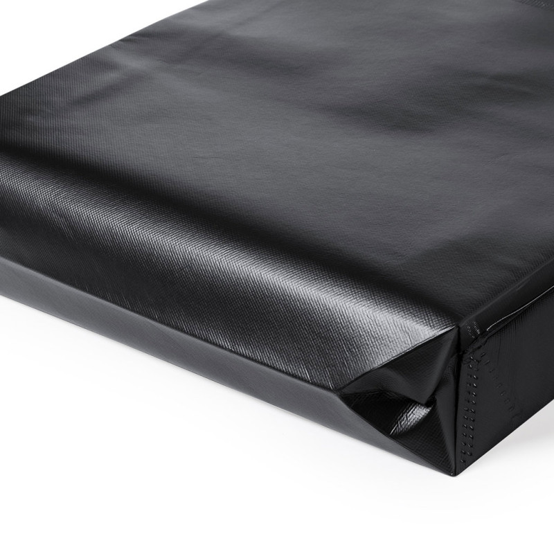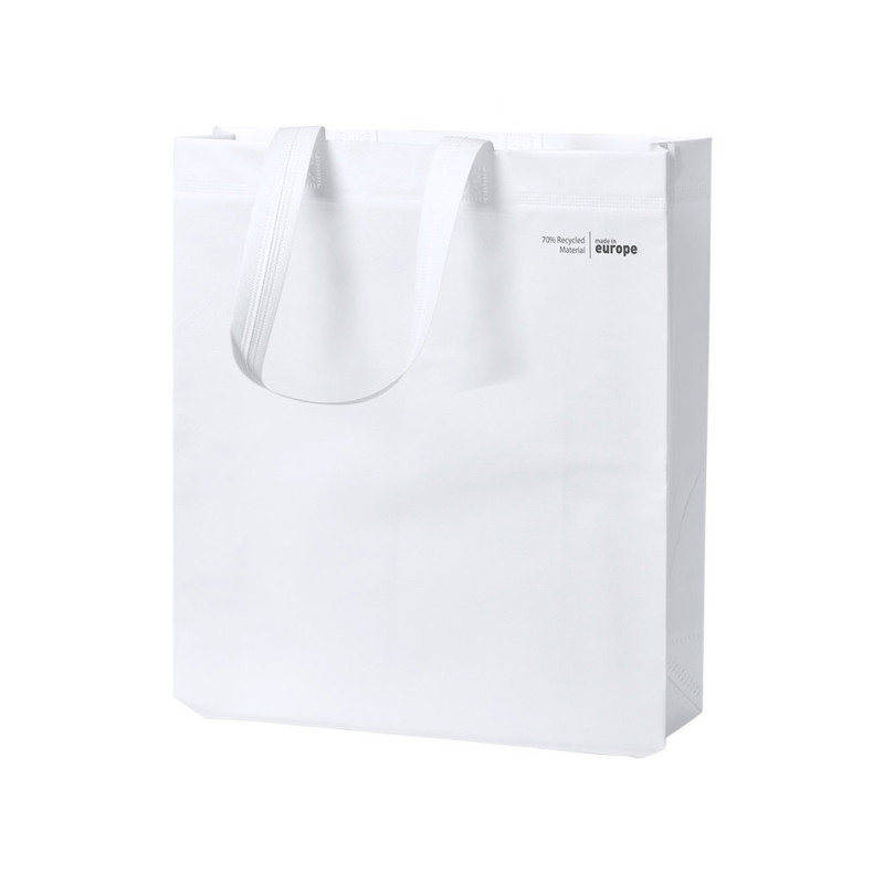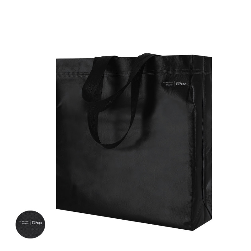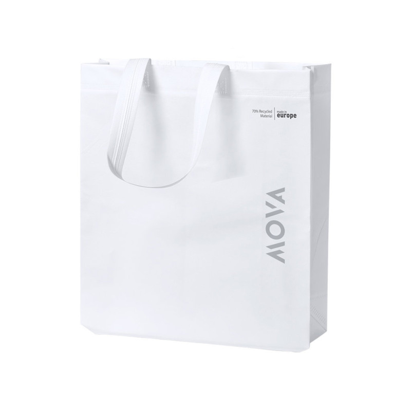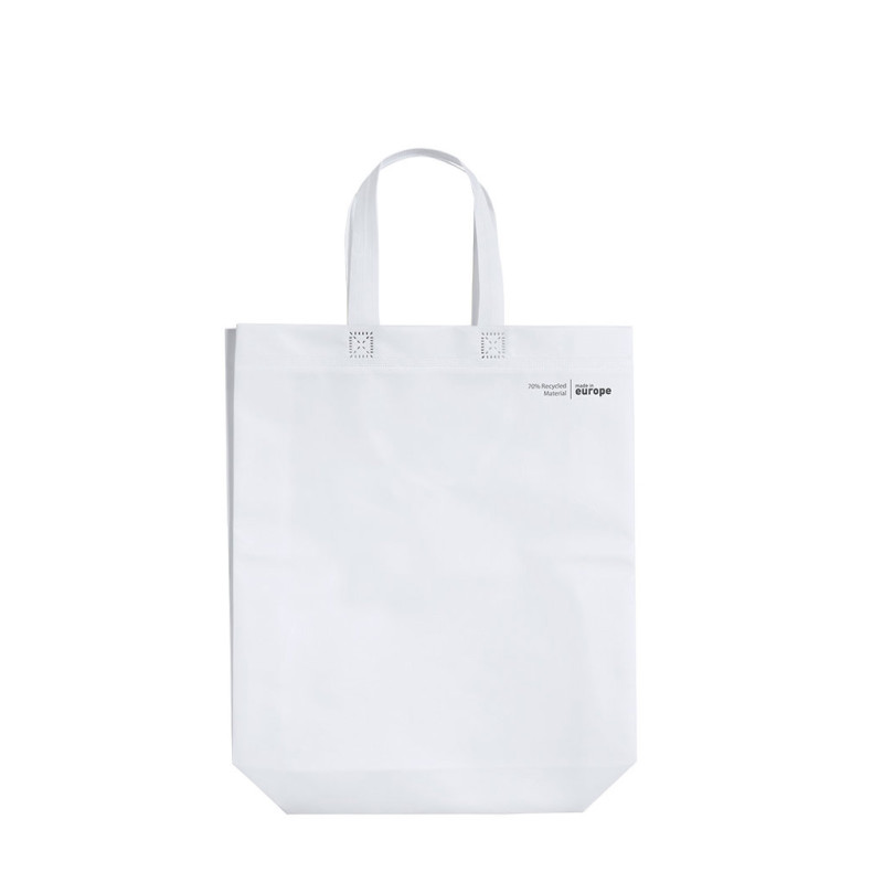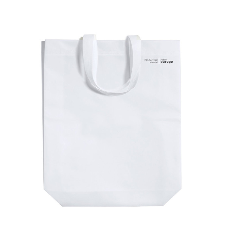 Saco da linha nature, fabricado em non-woven laminado reciclado de 120g/m2. De fabricação europeia, com acabamento termoselado, fole, alças compridas e distintivo eco/made in no saco.