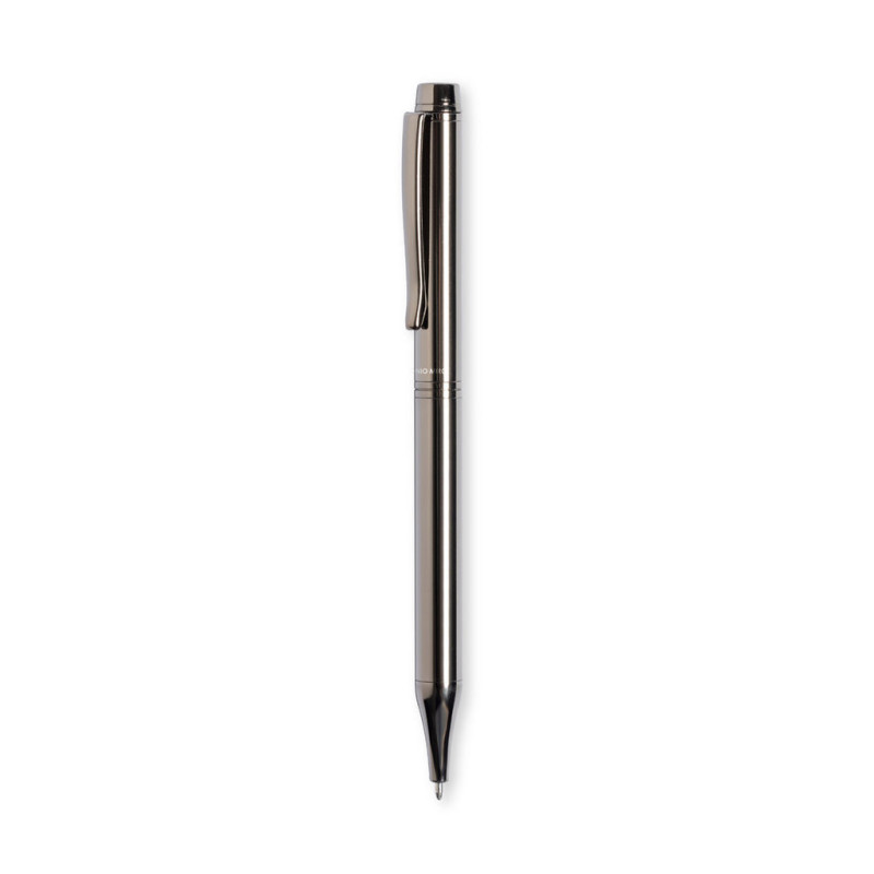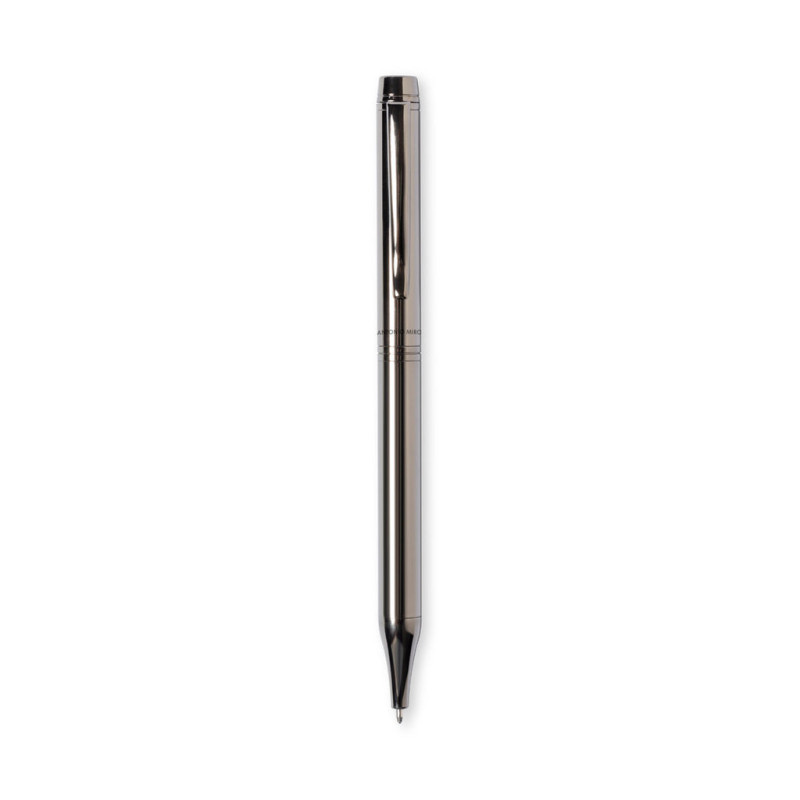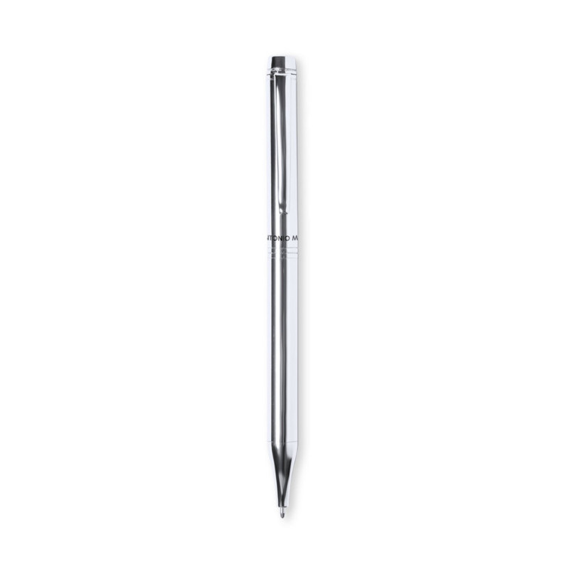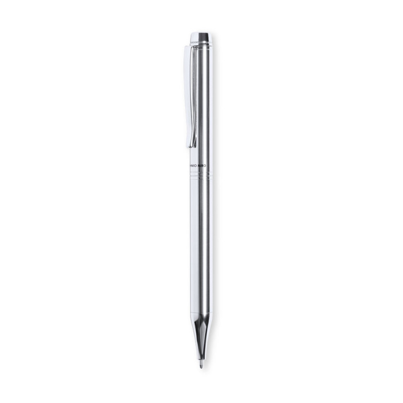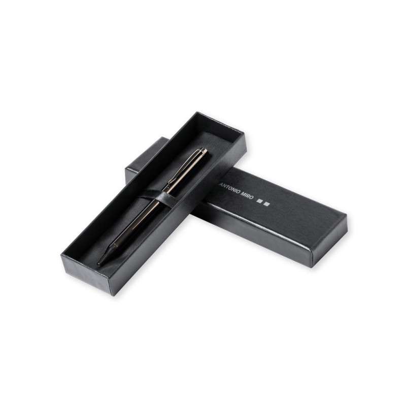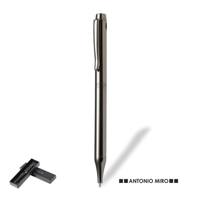 Esferográfica de Antonio Miró fabricada em metal de acabamento brilhante, com logotipo da marca no corpo e disponível numa variada gama de cores. Com mecanismo giratório e em tinta azul. Apresentada numa elegante e resistente caixa individual preta com logotipo Antonio Miró e estojo a condizer.