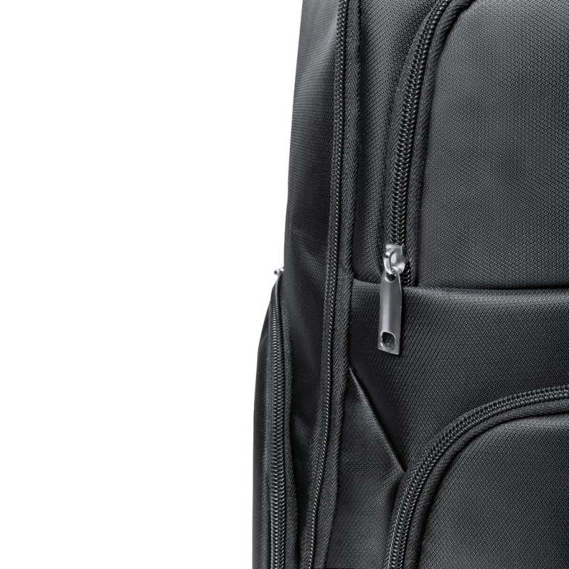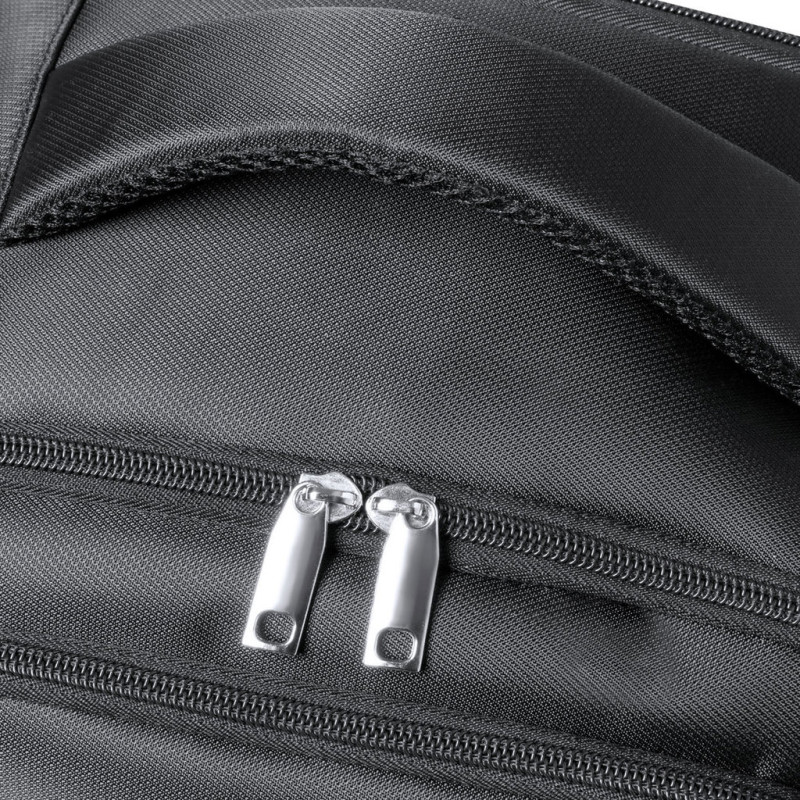 Mochila de qualidade premium fabricada em resistente Nyon 600D de acabamento em cor preto. Compartimento principal com fecho de correr a condizer e duplo puxador. Inclui 3 bolsos exteriores e 2 bolsos laterais, todos com fecho de correr. Acolchoado na pega, parte traseira e alças para ombros, que além disso são ajustáveis. Interior com compartimentos acolchoados para computador portátil de até 17 polegadas e tablet de até 12 polegadas. Acessório nas costas para ajuste em trolley.
