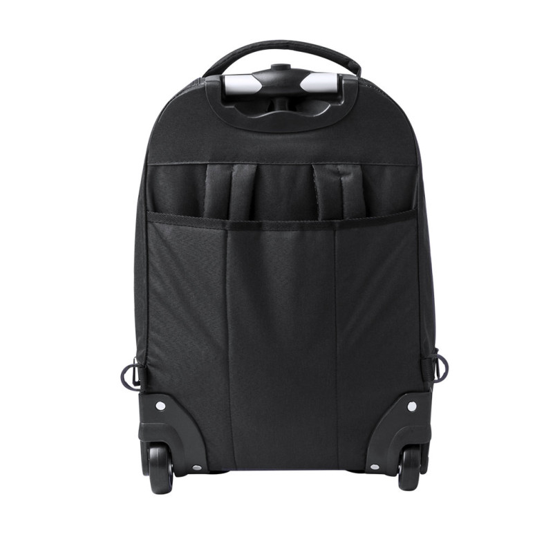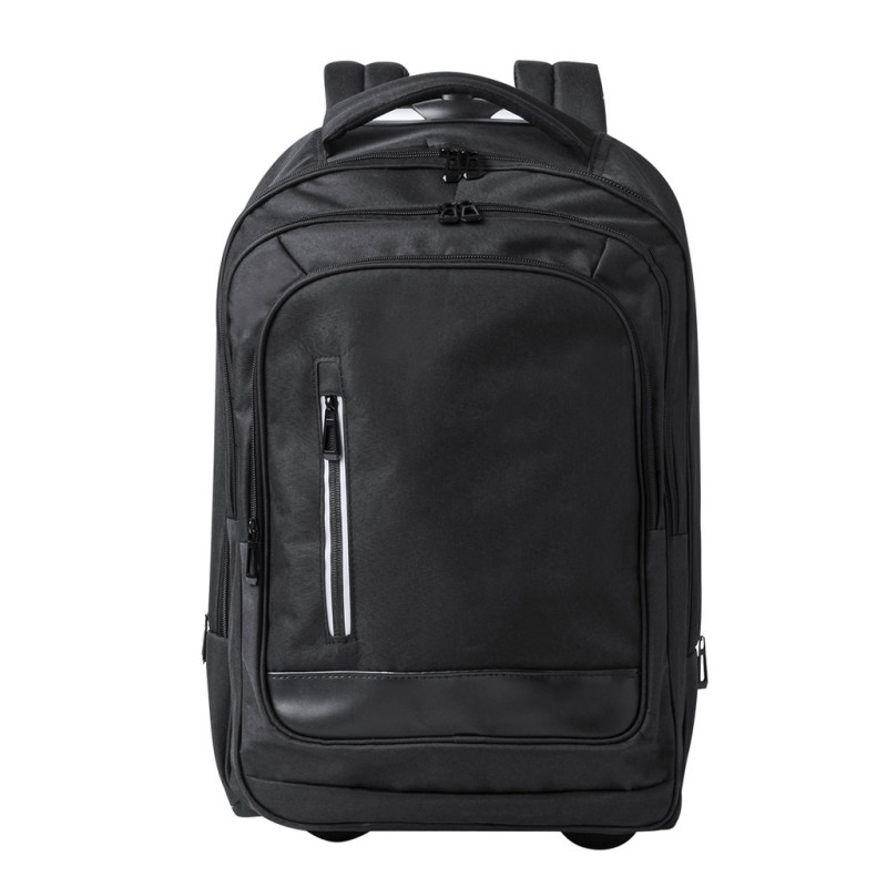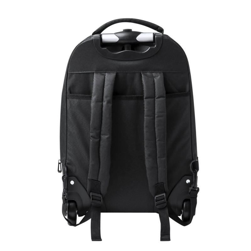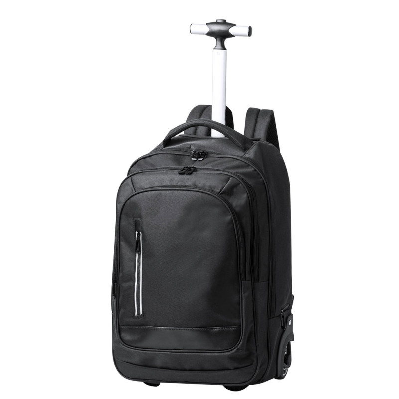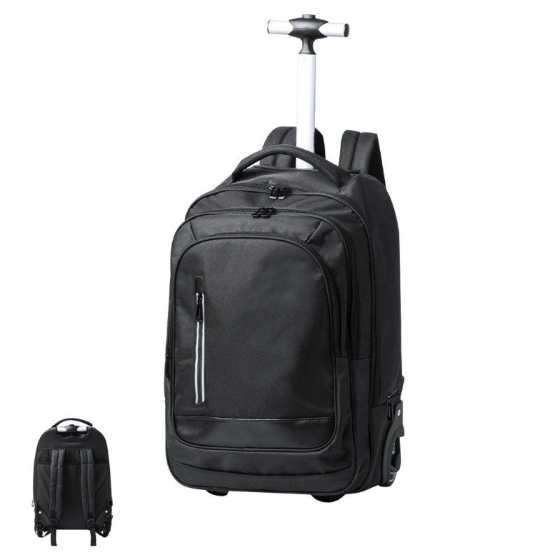 Mochila trolley de 2 rodas em poliéster 300D de alta qualidade. Inclui compartimento interior acolchoado para computador portátil de até 15 polegadas. Com pega exterior reforçada a condizer e práticos bolsos na parte frontal. Com fechos a condizer, além disso inclui alças para ombro acolchoadas e ocultas na parte posterior para usar como mochila. Apresentada numa bolsa individual reciclada.