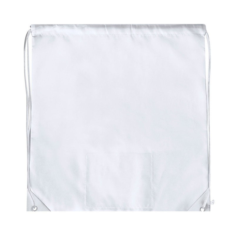 Saco mochila confeccionado em macio poliéster 210D. Possui cordões de fecho automático, esquinas reforçadas em preto e argolas metálicas de reforço. Conta com um bolso frontal porta dorsal e está disponível numa variada gama de cores (cor branca especialmente fabricada para impressão em sublimação).