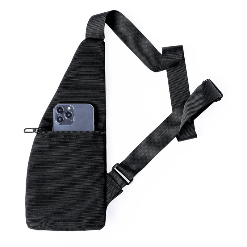 Bolsa tira-colo confeccionada em poliéster 300D, oferece múltiplos bolsos para uma organização efetiva. Dois bolsos principais que se encontram na zona frontal e lateral, junto com dos bolsos adicionais na parte frontal e traseira. Destaca-se por uma faixa refletora no bolso central para maior visibilidade. Apresenta-se de maneira individual numa bolsa reciclada.