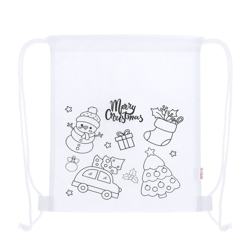 Mochila de Natal infantil feita de RPET não tecido, especialmente desenhada para colorir com lápis de cor. Com divertidos desenhos de Natal, incluindo 4 lápis de cor em diferentes cores. Possui cordões de auto-fecho e fechos de tecido, e uma etiqueta RPET do lado de fora.O material RPET é feito de plástico reciclado, promovendo assim a reutilização de resíduos plásticos e ajudando na sustentabilidade do planeta.