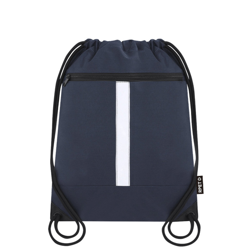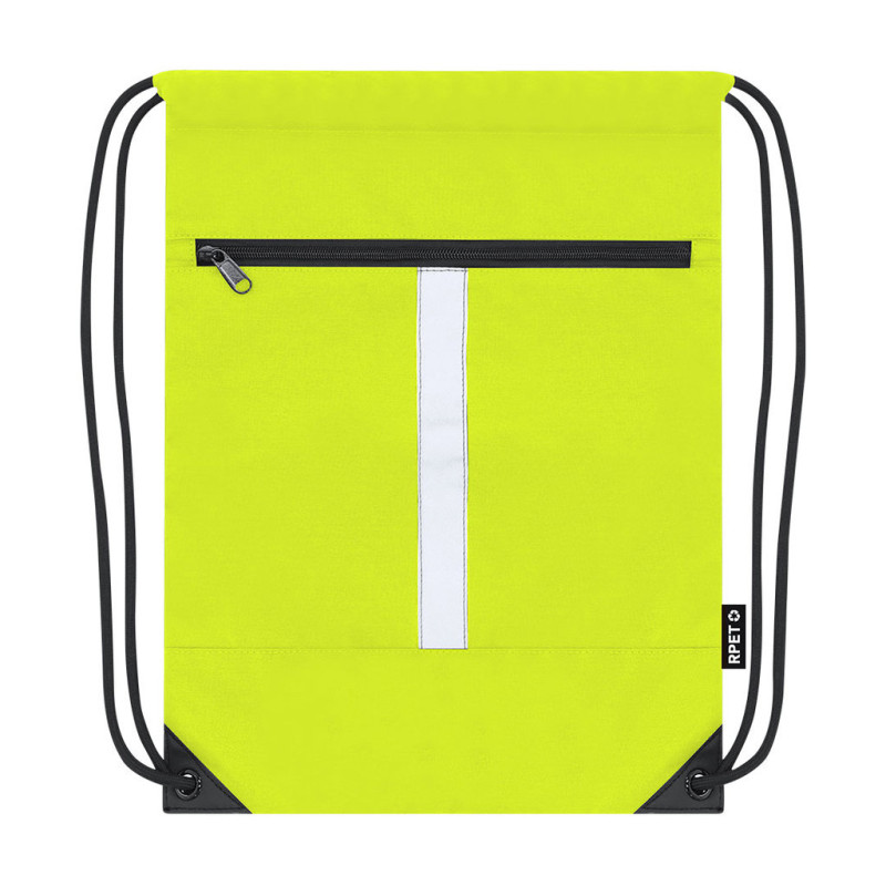 Mochila refletora em poliéster RPET 300D, com faixa refletora na parte frontal. Dispõe de um bolso frontal, cordões pretos de fecho automático e cantos reforçados com argolas metálicas para maior resistência.