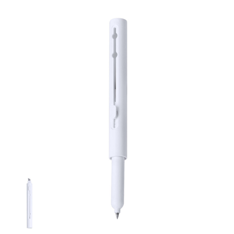 Caneta cortadora com corpo em ABS em acabamento mate. Com um botão que permite que o corpo da caneta saia numa extremidade em tinta azul e na outra, a ponta metálica do cortador pode ser retraída quando não está em uso para maior segurança. Ideal para cortes precisos.