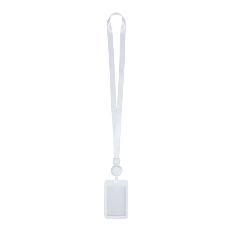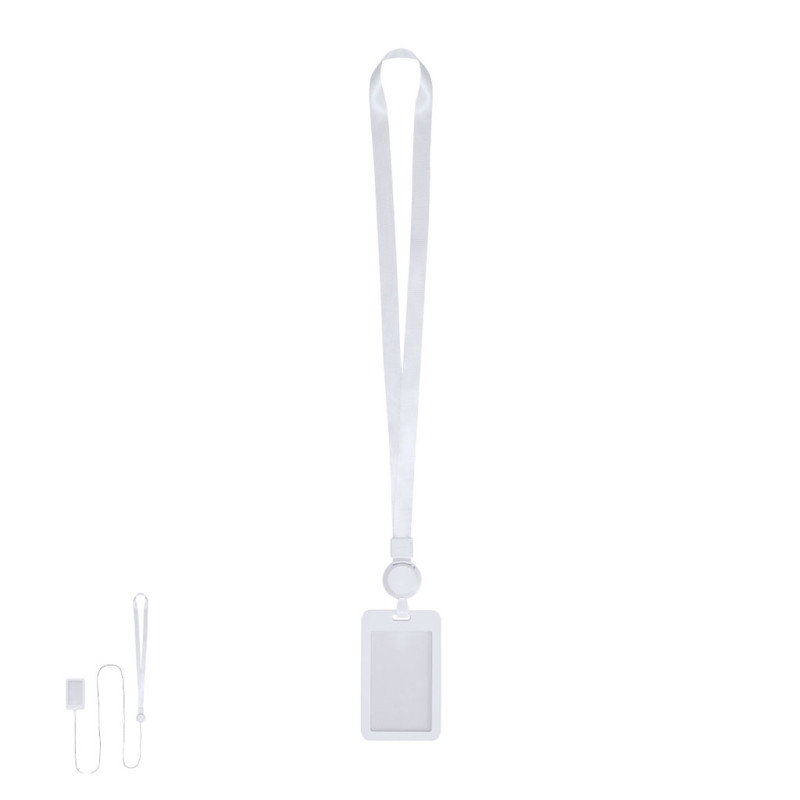 Identificador de cordão extensível. Suporte de cartão ABS destacável com traseira opaca e frente translúcida com fixação de clip. Corda extensível até 70 cm e cordão de poliéster branco.