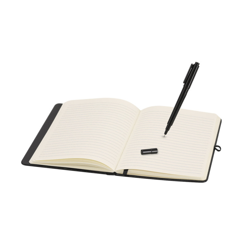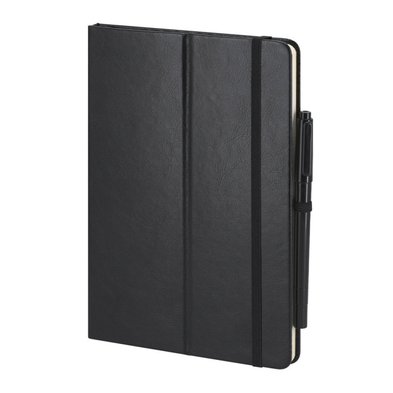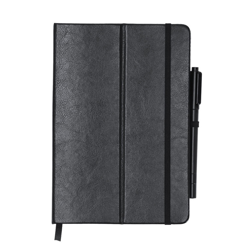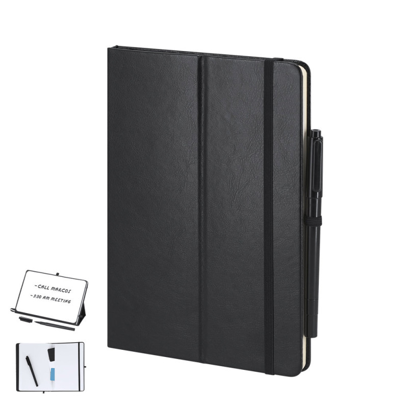 Bloco de notas de quadro negro em PU reciclado. Com um quadro negro na primeira página, inclui uma caneta marcador e uma borracha em tinta preta. Com 80 folhas disponíveis numa risca. Cobertura dobrável com função de suporte e elástico para fecho seguro. Ideal para tirar notas rápidas, apontar, criar designs no seu dia de trabalho ou em casa. Inclui logótipo distintivo PU Recycled.