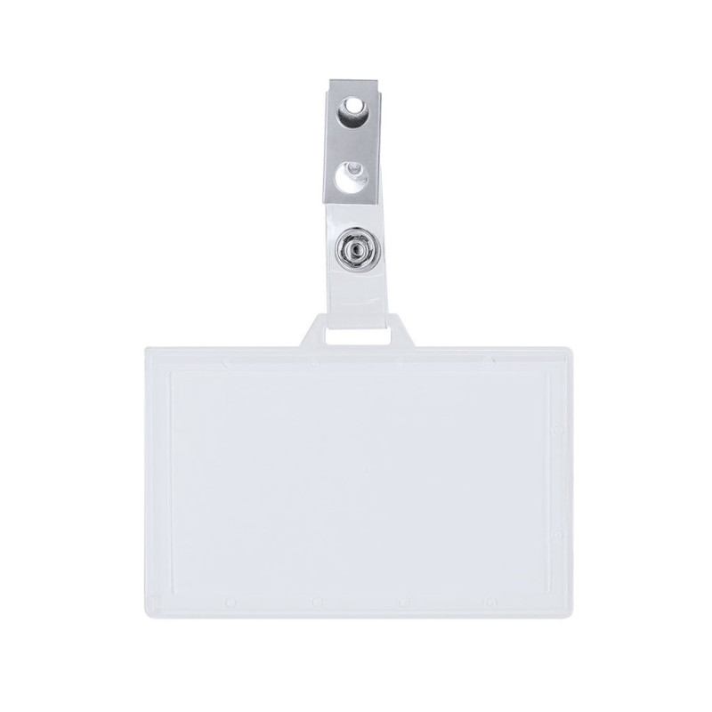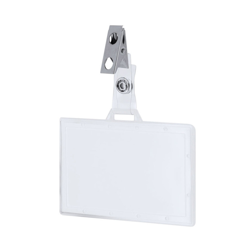 Identificador rígido PS com grampo metálico na orientação horizontal. O ideal é ficar por perto e mostrar a sua identificação. O sistema de fecho é removível e pode usar o identificador em conjunto com o cordão.