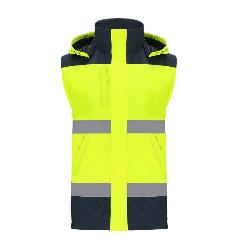 Casaco acolchoado de alta visibilidade com design bicolor. Confeccionado em tecido exterior impermeável e costuras termosseladas, garante proteção eficaz contra o vento e a chuva.Apresenta duas faixas refletoras horizontais no corpo e duas nas mangas, assegurando excelente visibilidade em condições de baixa luminosidade.Inclui capuz enrolável, fecho frontal de correr com pala em velcro, bem como punhos ajustáveis e cintura elástica para um ajuste confortável e funcional.Dispõe de dois bolsos laterais com fecho de correr, um bolso no peito direito e um bolso interior com fecho de correr.Integra acesso traseiro interior para reprocessamento ou personalização.