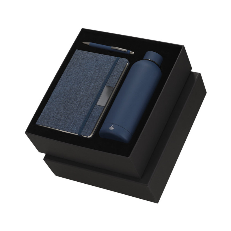 Conjunto de blocos de notas e caneta, assim como uma garrafa térmica de aço inoxidável. O conjunto inclui: - bloco de notas de capa rígida em RPET, com 80 páginas às riscas, elástico com clip metálico e marcador de página a condizer.- Caneta esferográfica de alumínio reciclado com acabamento borrachudo, carga jumbo e tinta azul. - Garrafa térmica de parede dupla feita de aço inoxidável de 500ml. Com tampa de rosca. Com o distintivo logótipo da Recycled Stainless Steel.