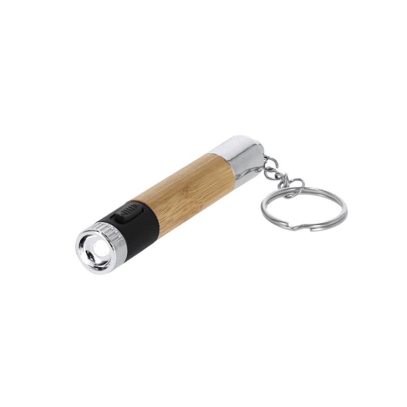 Caneta com lanterna LED integrada. Design original, com corpo e capuz em bambu com anel metálico cromado. Em tinta azul e com pilhas de botão incluídas.