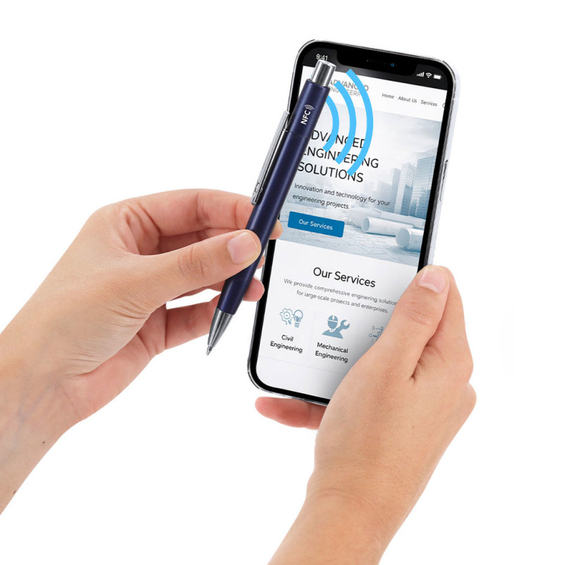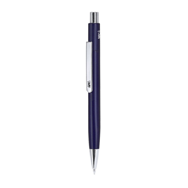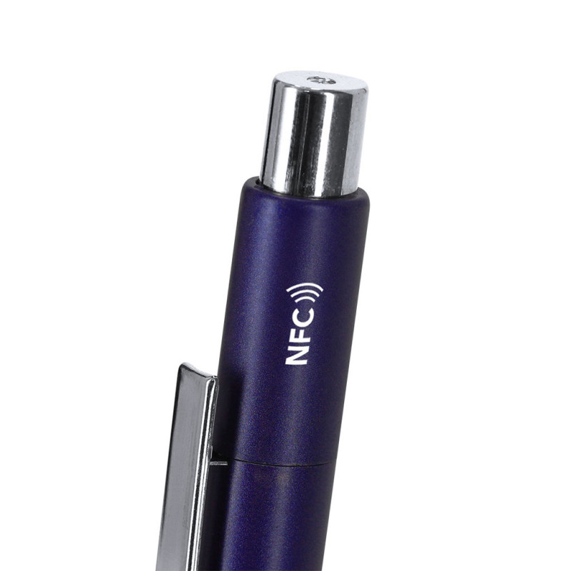 Caneta NFC com corpo de alumínio com acabamento mate. Clip prateado a condizer com botão e ponta. Tinta azul. Caneta com etiqueta NFC integrada, compatível com todos os smartphones e dispositivos inteligentes com tecnologia NFC. Permite-lhe transmitir a informação que deseja de forma rápida e fácil: basta aproximar o dispositivo da caneta para aceder instantaneamente a links, páginas web, vídeos, redes sociais e muito mais. Uma solução inovadora que liga a sua marca com um gesto simples.