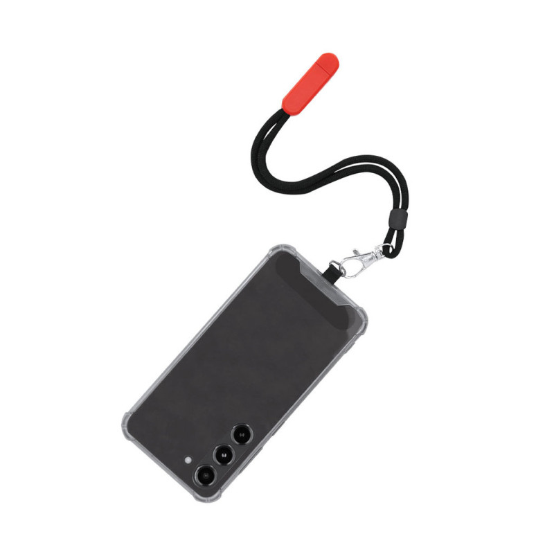 Pulseira móvel original em poliéster macio, adaptável a todos os tipos de pulsos. Com um acessório de transporte para colocar entre a capa e o smartphone, preso por um mosquetão metálico. Inclui suporte ABS, ideal para deixar o seu dispositivo móvel.