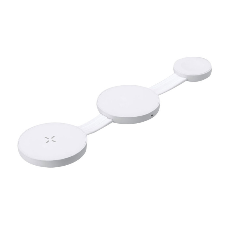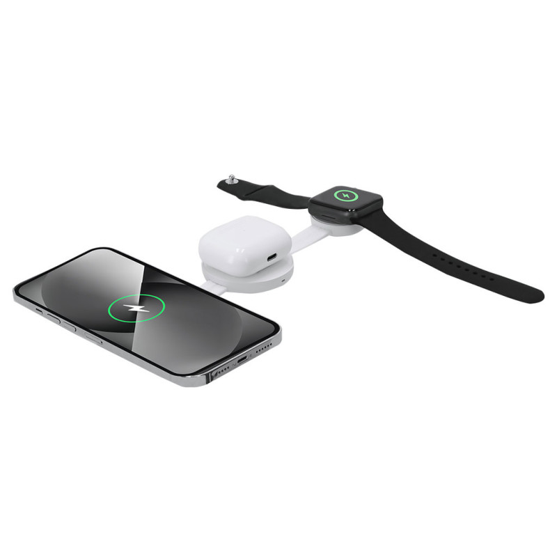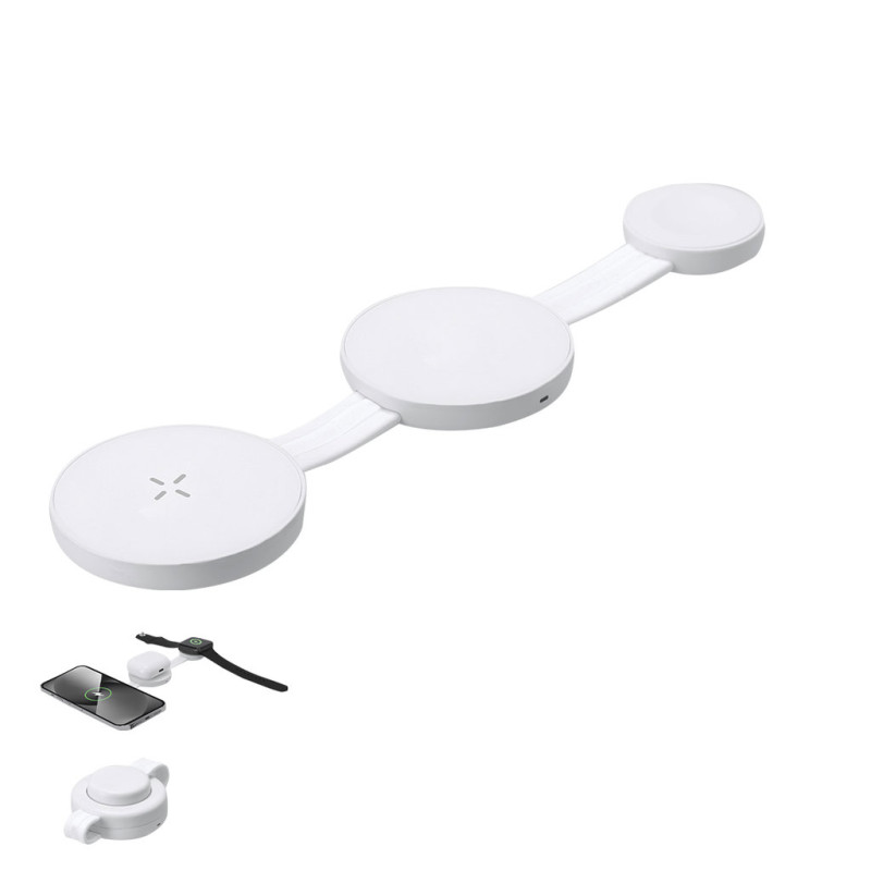 Carregador sem fios magnética de 15W, 3 em 1W, feito de ABS. Concebido para carregamento simultâneo de smartphones, auscultadores e smartwatch, e ultracompacto em tamanho. Um gadget tudo-em-um: dobrável, portátil, altamente versátil e funcionalmente concebido. Ligação USB Tipo C -cabo incluído-.