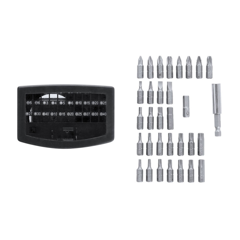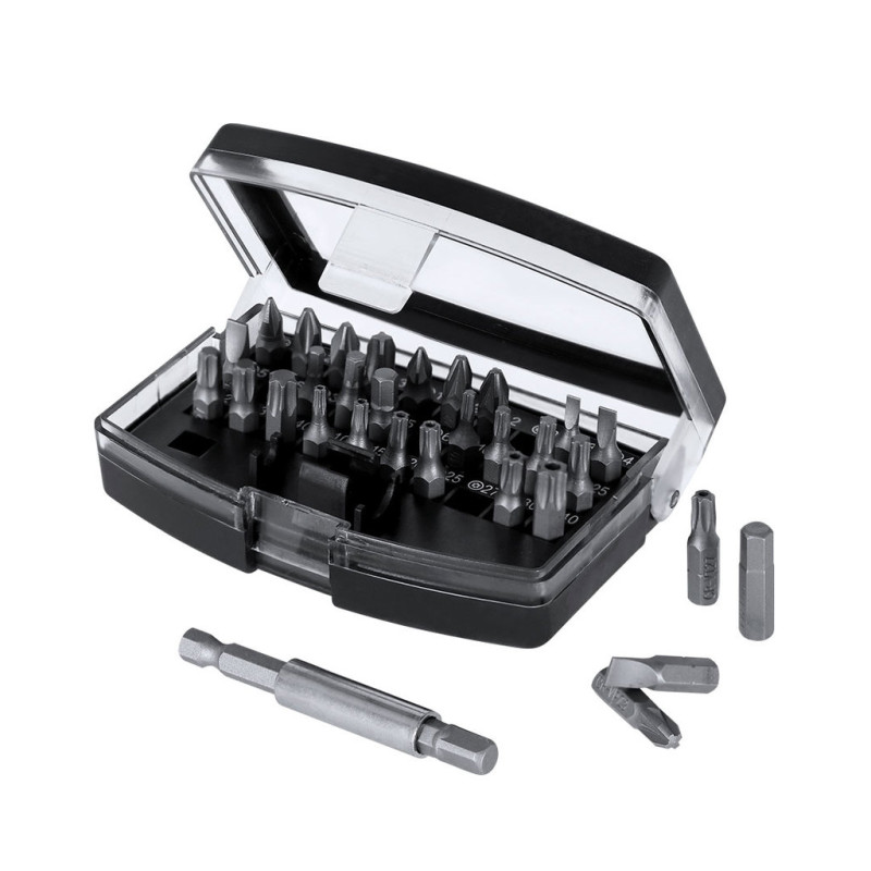 Conjunto prático de ferramentas com caixa feita de ABS. Inclui um adaptador de precisão com 32 acessórios magnéticos, compostos por várias pontas: philips, star, flat, hexagonal e torx.
