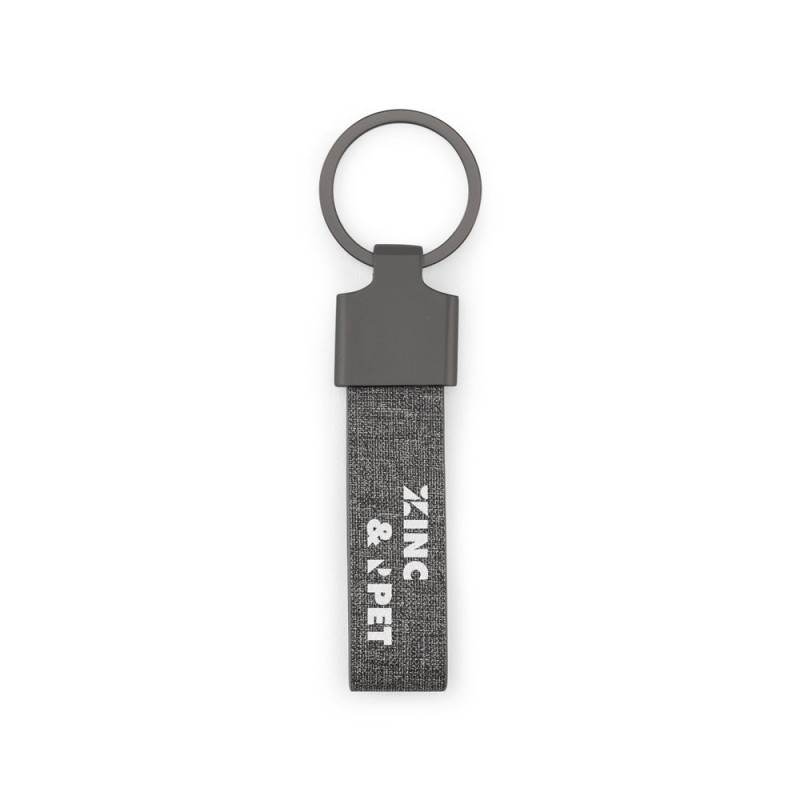 Porta-chaves em metal e PET (30% reciclado), com formato retangular. Possui uma argola para facilitar a colocação de chaves e pequenos objetos. Fornecido em bolsa em papel kraft. Argola: ø 32 mm | Produto: 87 x 25 x 7 mm | Total: 115 x 32 x 7 mm | Bolsa: 135 x 55 mm
