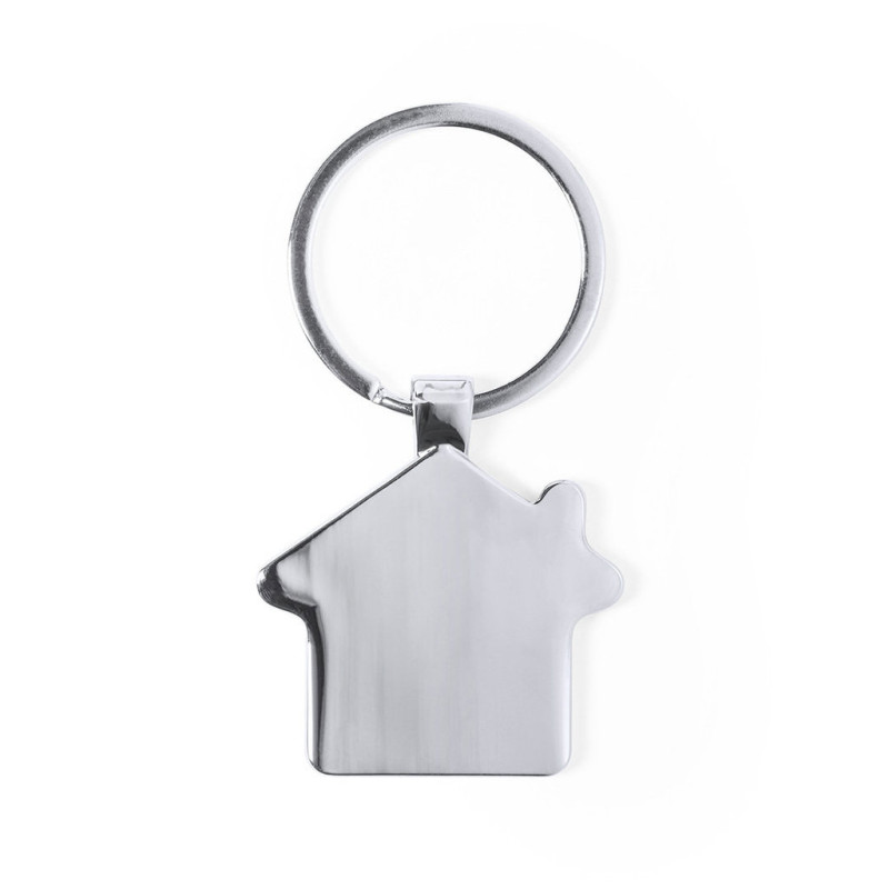 Porta-chaves com forma de casa de linha nature, em combinação de materiais metal de acabamento brilhante e bambú. Com ampla superfície para impressão e apresentado em bolsa individual com cartão kraft.