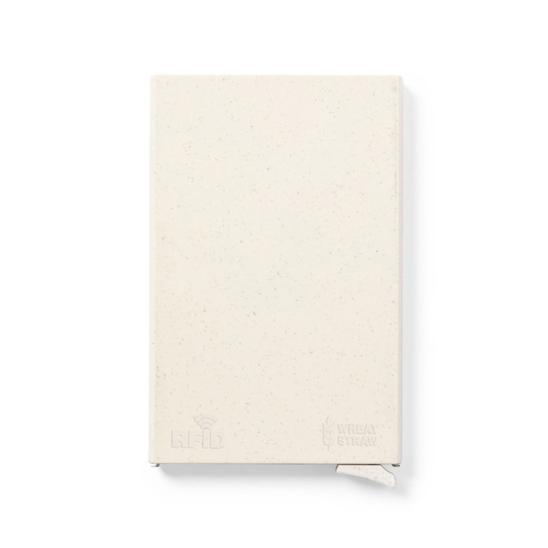 Porta-cartões de linha nature fabricado em palha de trigo. Capacidade até 5 cartões, com engenhoso mecanismo, desliza e extrae o accesso aos cartões. Tecnologia de segurança RFID (Identificação por Radio Frequência) que mantém seguros os seus dispositivos de transmissão de identidade. Distintivos RFID e palha de trigo injectado no molde. A palha de trigo fomenta a utilização de matérias-primas naturais, reduzindo assim as emissões poluentes.