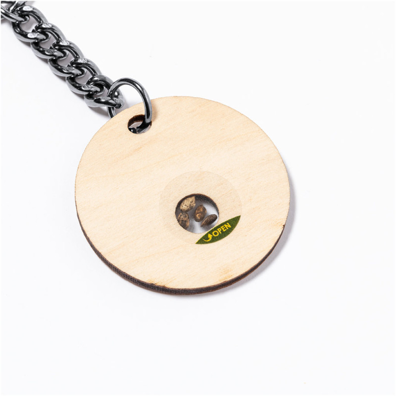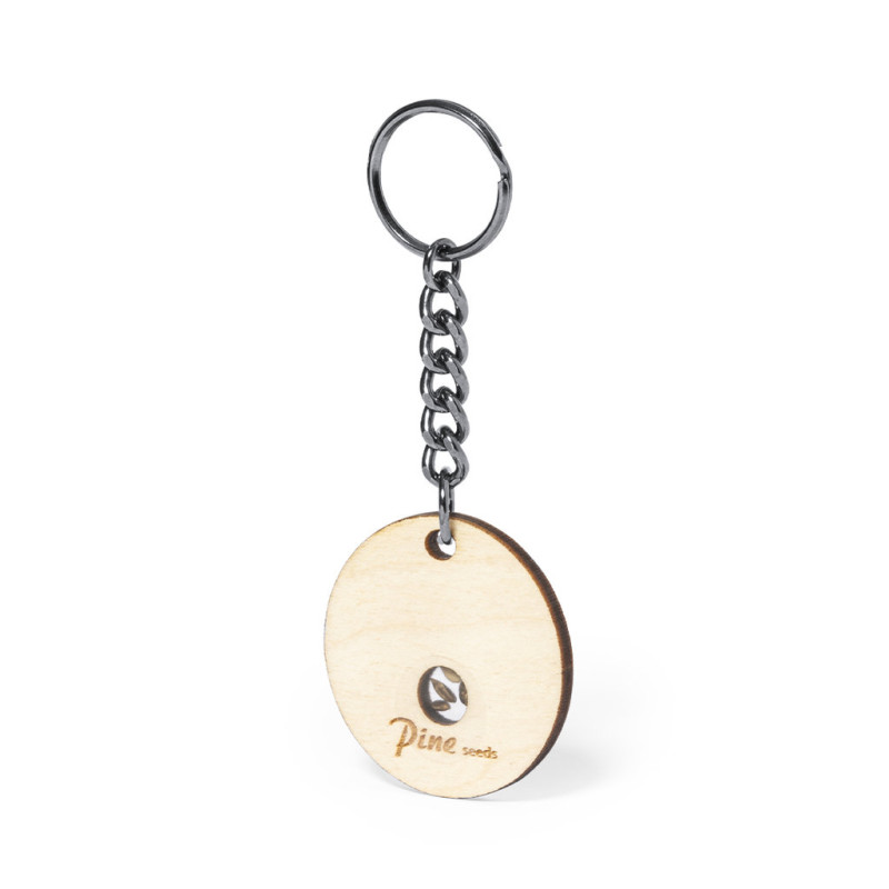 Porta-chaves em suave e elegante madeira de faia. Inclui cápsula com sementes de pinho. Um respeitoso e sustentável brinde para fomentar e promover o cuidado com o meio ambiente. Apresentado em caixa individual de design kraft.