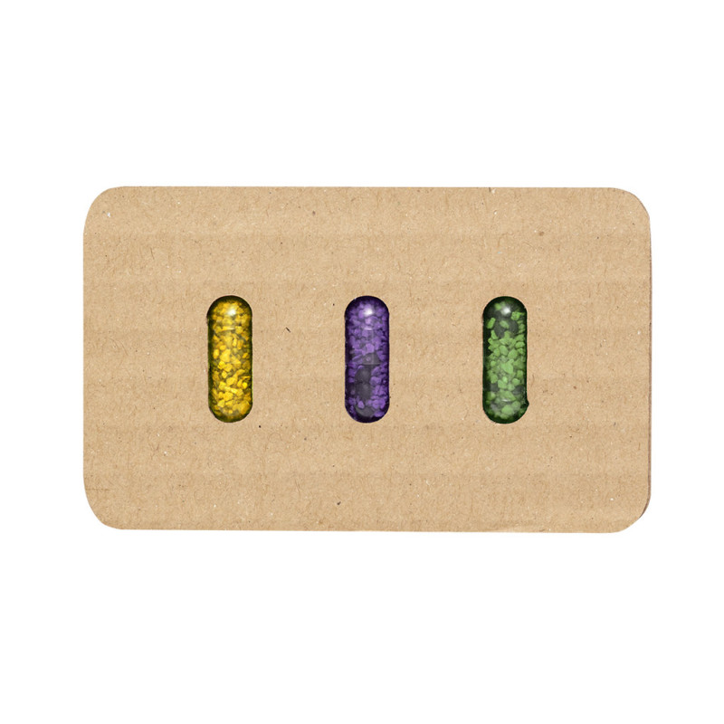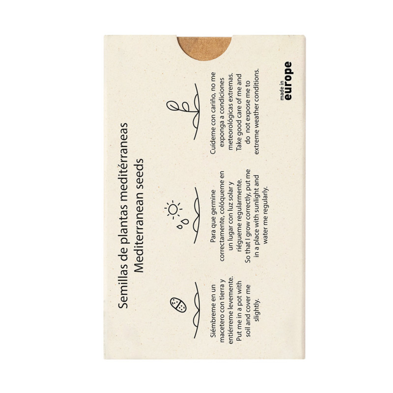 Set de cápsulas com sementes apresentado num estojo recortado de cartão reciclado com instruções de plantação. Este kit de horta contém sementes de lavanda, funcho e endro.