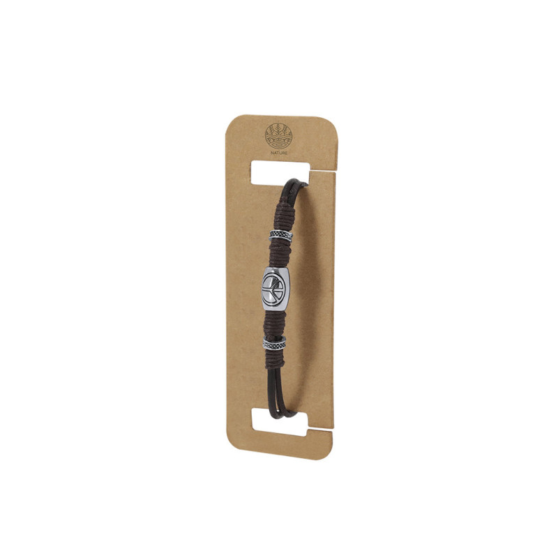 Pulseira de couro marrom decorada com cordões de algodão encerado e contas banhadas a prata, uma delas com o símbolo da paz. Com um fecho de liga tom prata original. Apresentado em uma caixa de papel kraft com uma superfície para branding.