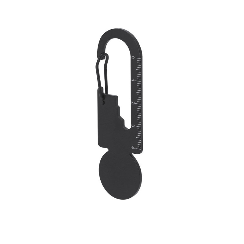Multiferramenta em aço inoxidável com acabamento preto mate. Projetado para atender a múltiplas necessidades, inclui 8 funções: chave para porcas hexagonais de vários tamanhos, régua para medições, abridor de garrafas, moeda para carrinho, etc. Com fecho de lagosta.